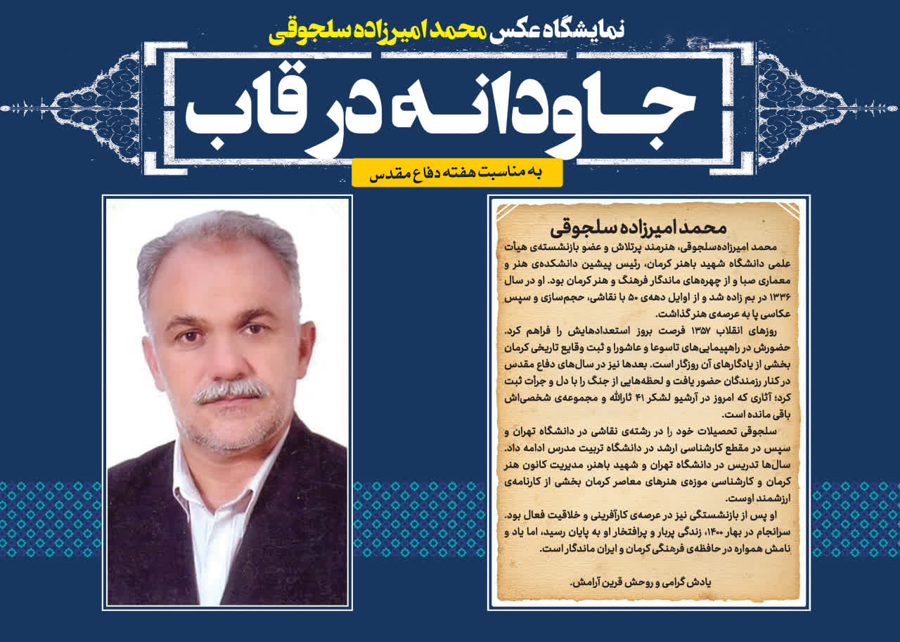 به همت حوزه معاونت فرهنگی و اجتماعی دانشگاه شهید باهنر کرمان و همزمان با هفته دفاع مقدس، نمایشگاه عکس «جاودانه در قاب» با محوریت آثار زندهیاد محمد امیرزاده سلجوقی برپا و با حضور رئیس دانشگاه گشایش یافت.