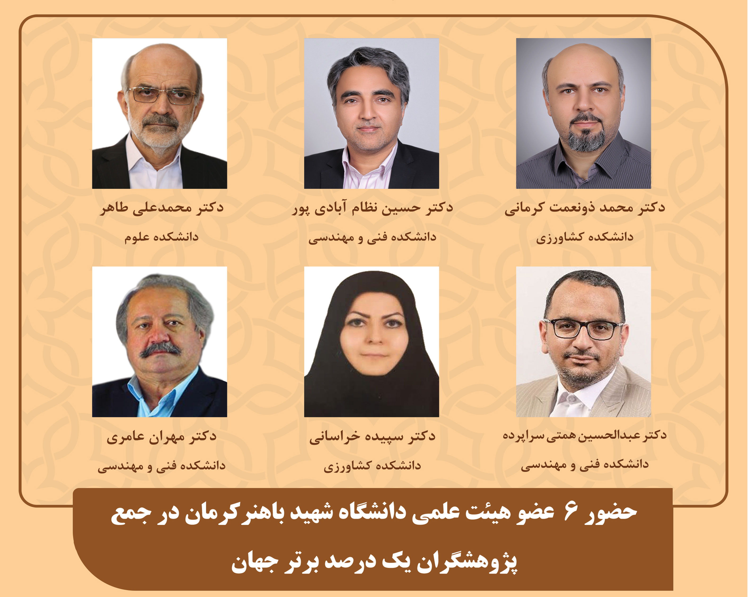 بر اساس تازه‌ترین گزارش مؤسسه استنادی و پایش علم‌وفناوری جهان اسلام (ISC)، فهرست پژوهشگران ایرانی پراستناد یک درصد برتر جهان در سال ۱۴۰۴ منتشر شد و نام شش نفر از اعضای هیئت‌علمی دانشگاه شهید باهنر کرمان در میان برگزیدگان این فهرست معتبر قرار گرفت.