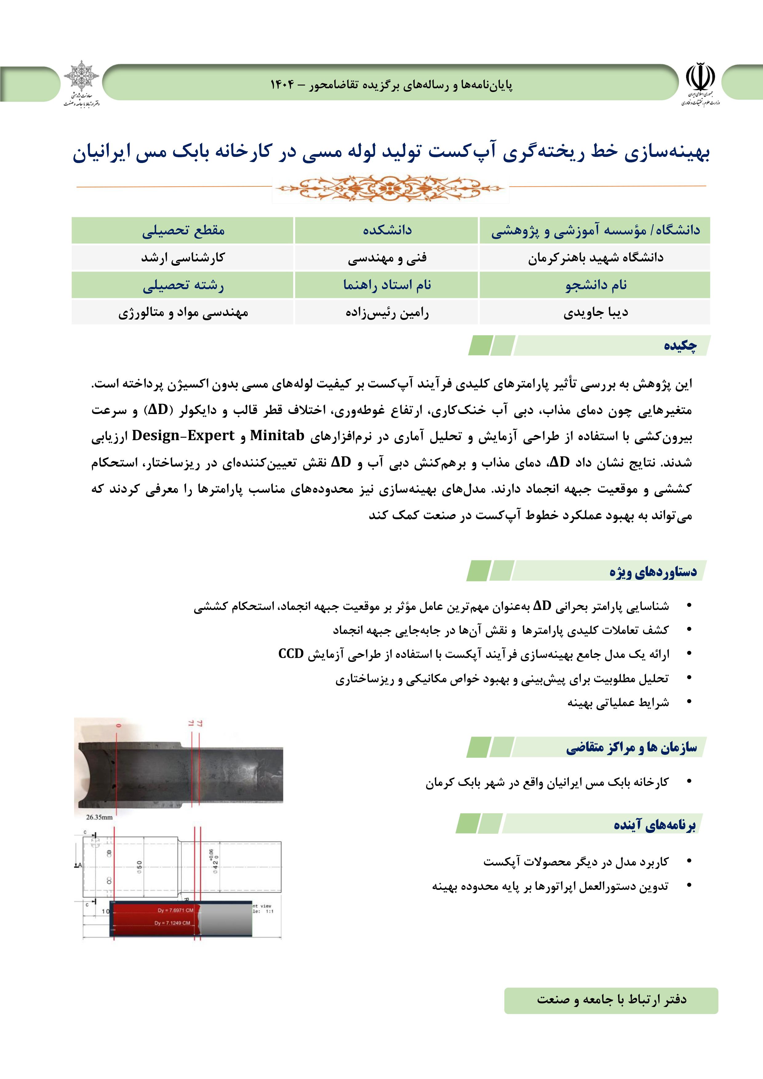 بهینه‌سازی خط ریخته‌گری آپ‌کست تولید لوله مسی در کارخانه بابک مس ایرانیان پژوهشگر: دیبا جاویدی، دانشجوی کارشناسی‌ارشد مهندسی مواد و متالورژی استاد راهنما: دکتر رامین رئیس‌زاده