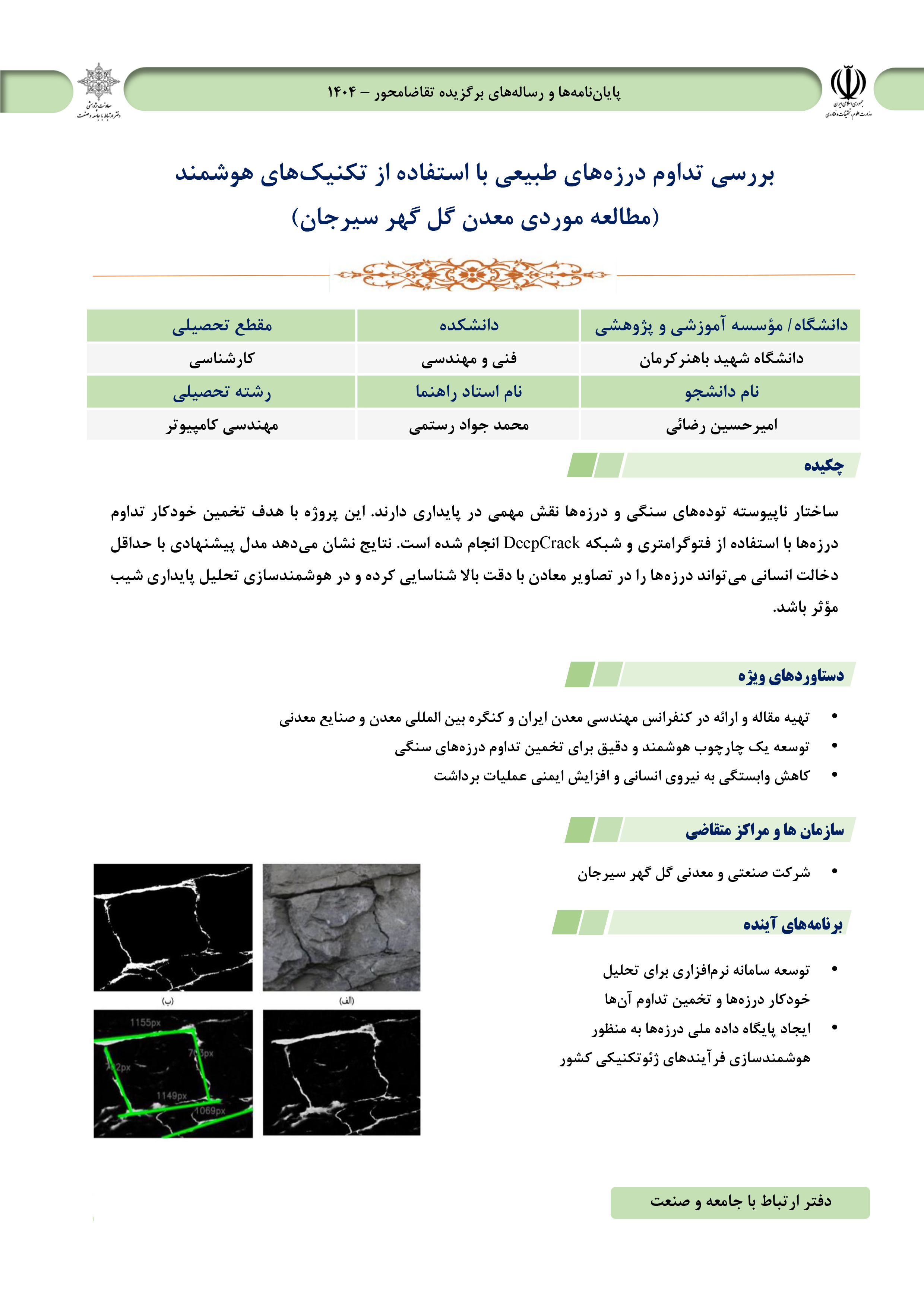 بررسی تداوم درزه‌های طبیعی با استفاده از تکنیک‌های هوشمند (مطالعه موردی معدن گل‌گهر سیرجان) پژوهشگر: امیرحسین رضایی، دانشجوی کارشناسی مهندسی کامپیوتر استاد راهنما: دکتر محمدجواد رستمی