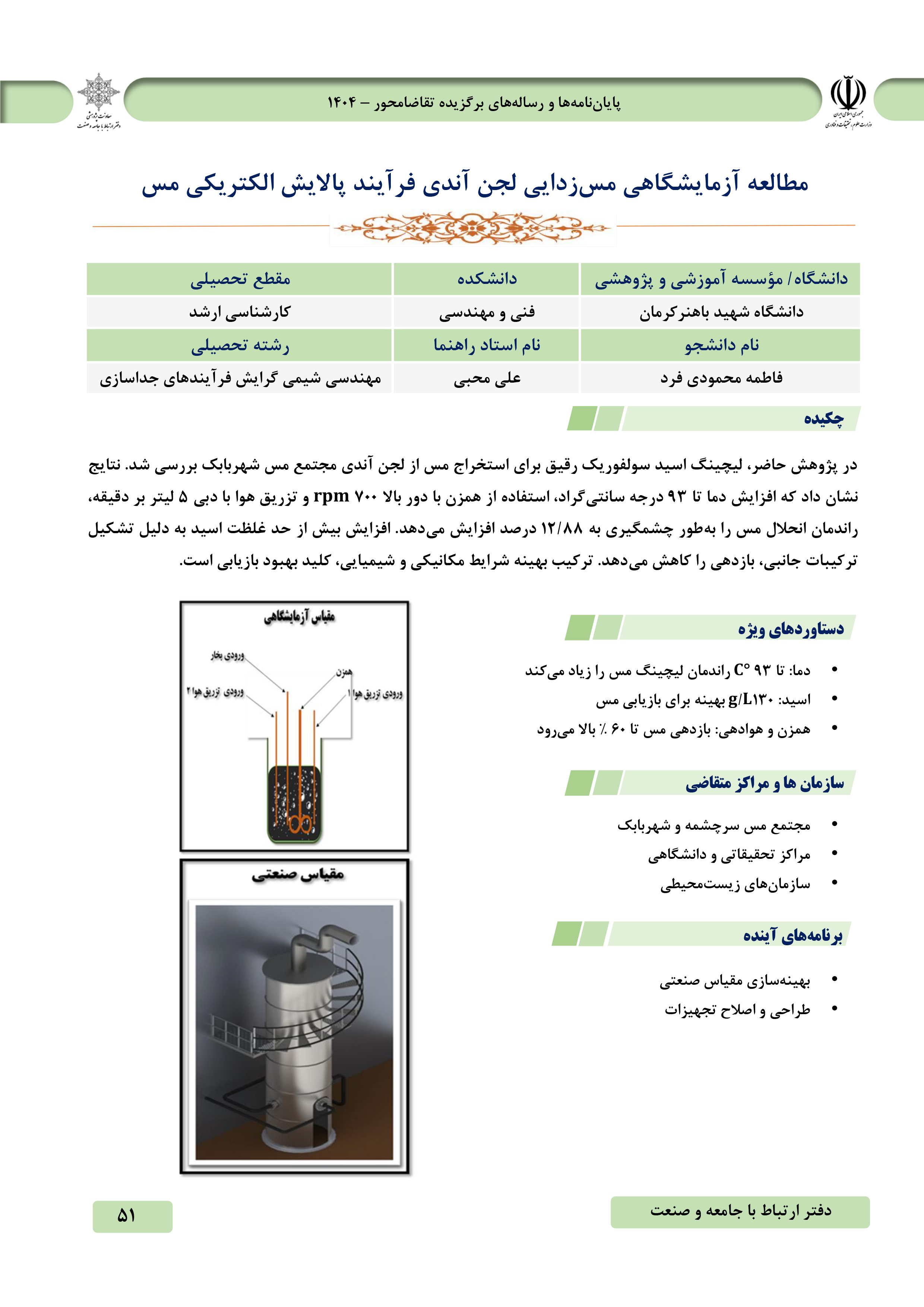 مطالعه آزمایشگاهی مس‌زدایی لجن آندی فرایند پالایش الکتریکی مس پژوهشگر: فاطمه محمودی‌فرد، دانشجوی کارشناسی‌ارشد مهندسی شیمی - فرایندهای جداسازی استاد راهنما: دکتر علی محبی