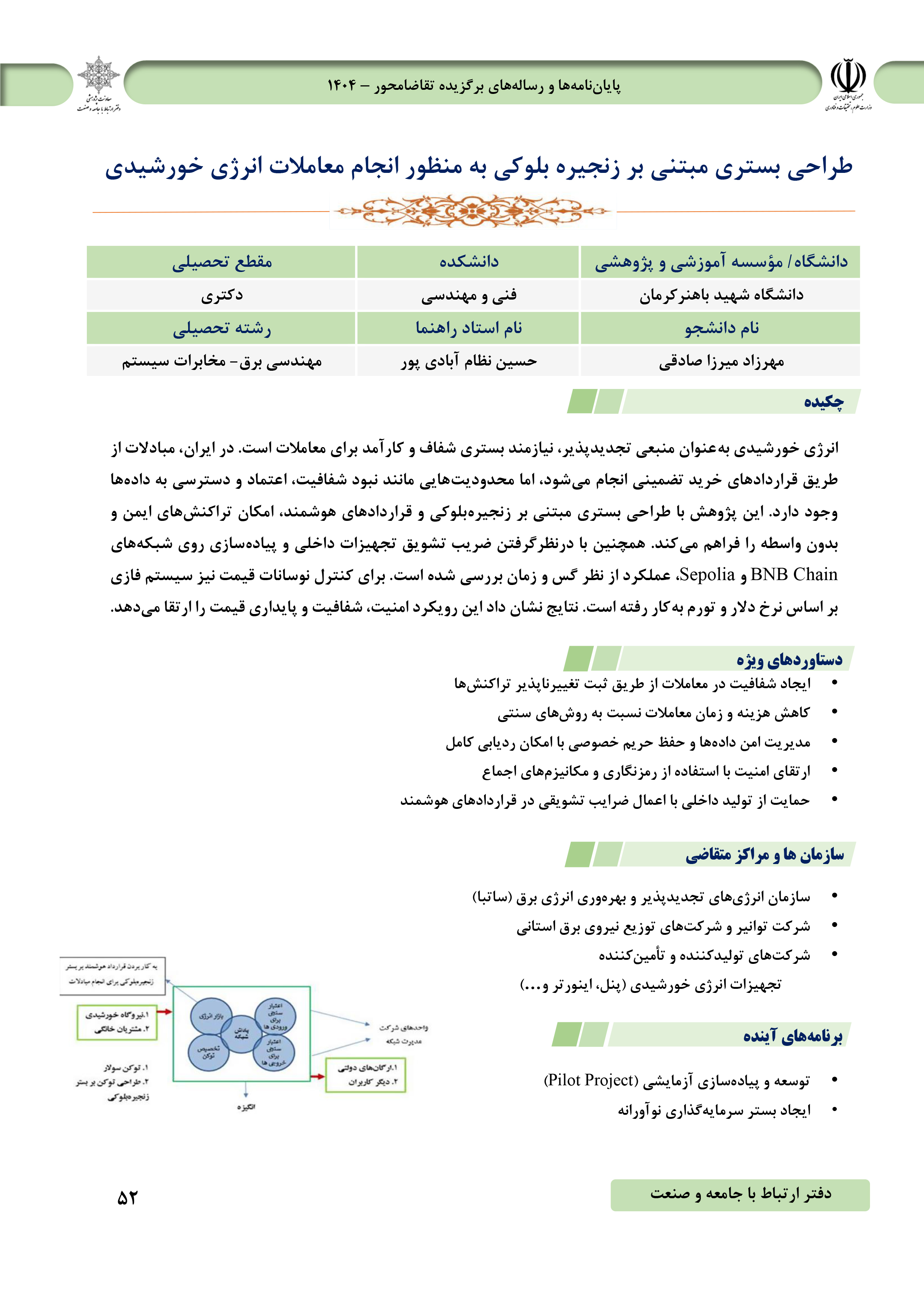 طراحی بستری مبتنی بر زنجیره بلوکی برای انجام معاملات انرژی خورشیدی پژوهشگر: مهرزاد میرزا صادقی، دانشجوی دکتری مهندسی برق - مخابرات سیستم استاد راهنما: دکتر حسین نظام‌آبادی‌پور