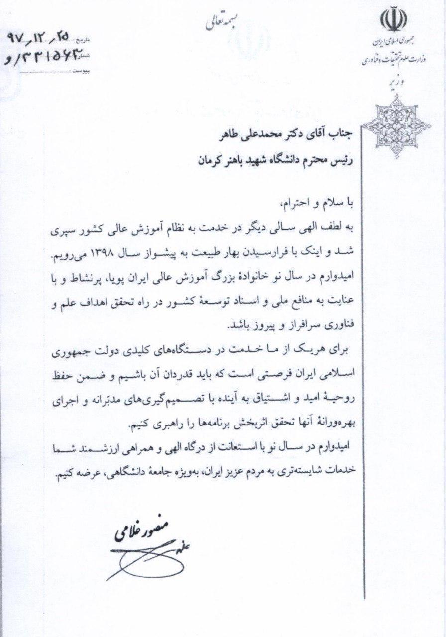 پیام نوروزیِ دکتر منصور غلامی وزیر علوم، تحقیقات و فناوری به دکتر محمدعلی طاهر رئیس دانشگاه شهیدباهنر کرمان