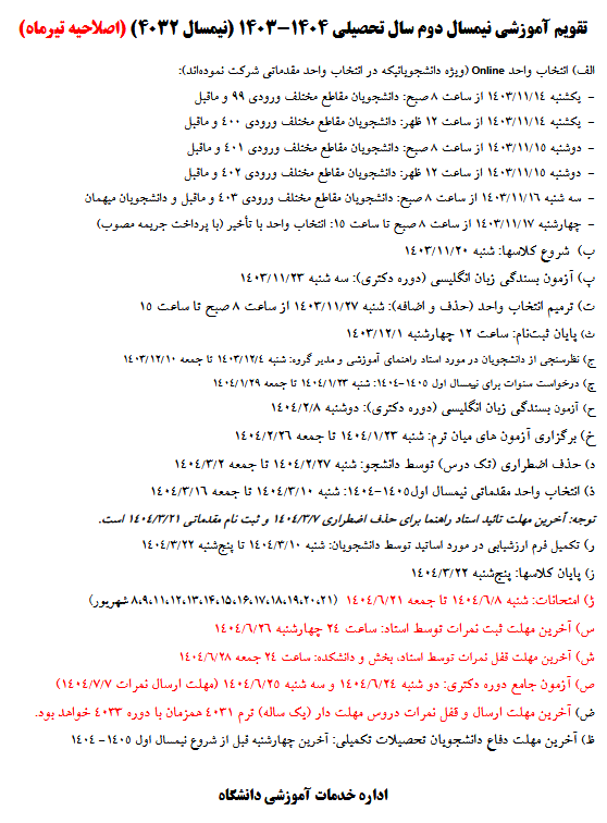 تقویم آموزشی نیمسال دوم سال تحصیلی1404- 1403(ترم 4032) (اصلاحیه تیرماه 1404)