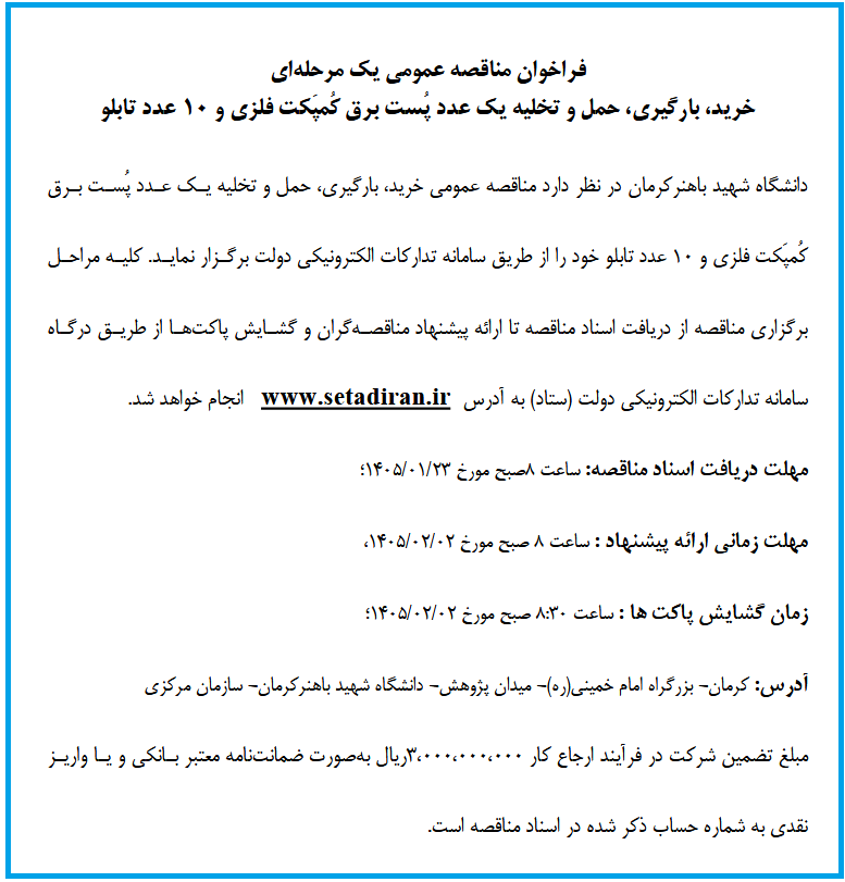 دانشگاه شهید باهنرکرمان در نظر دارد مناقصه عمومی خرید، بارگیری، حمل و تخلیه یک عدد پُست برق کُمپَکت فلزی و 10 عدد تابلو خود را از طریق سامانه تدارکات الکترونیکی دولت برگزار نماید. کلیه مراحل برگزاری مناقصه از دریافت اسناد مناقصه تا ارائه پیشنهاد مناقصه‌گران و گشایش پاکت‌ها از طریق درگاه سامانه تدارکات الکترونیکی دولت (ستاد) به آدرس  www.setadiran.ir   انجام خواهد شد.