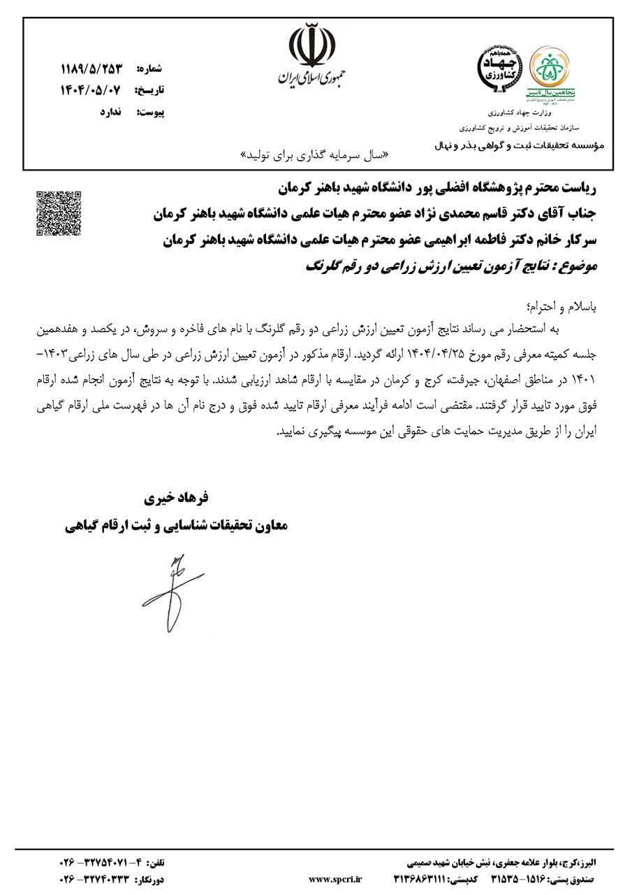 به گزارش روابط عمومی دانشگاه شهید باهنر کرمان، این موفقیت حاصل سال‌ها تلاش علمی و پژوهشی در آزمایشگاه‌ها و مزارع تحقیقاتی دانشگاه و نتیجه پیگیری‌های دقیق در زمینه غربالگری ژنتیکی، ارزیابی‌های زراعی و آزمایش‌های میدانی در شرایط اقلیمی متنوع است.ثبت ارقام جدید گیاه گلرنگ، به‌عنوان نخستین گزارش رسمی ثبت رقم در دانشگاه شهید باهنر کرمان، نقطه‌عطفی در تاریخ فعالیت‌های علمی این دانشگاه به‌شمار می‌رود.