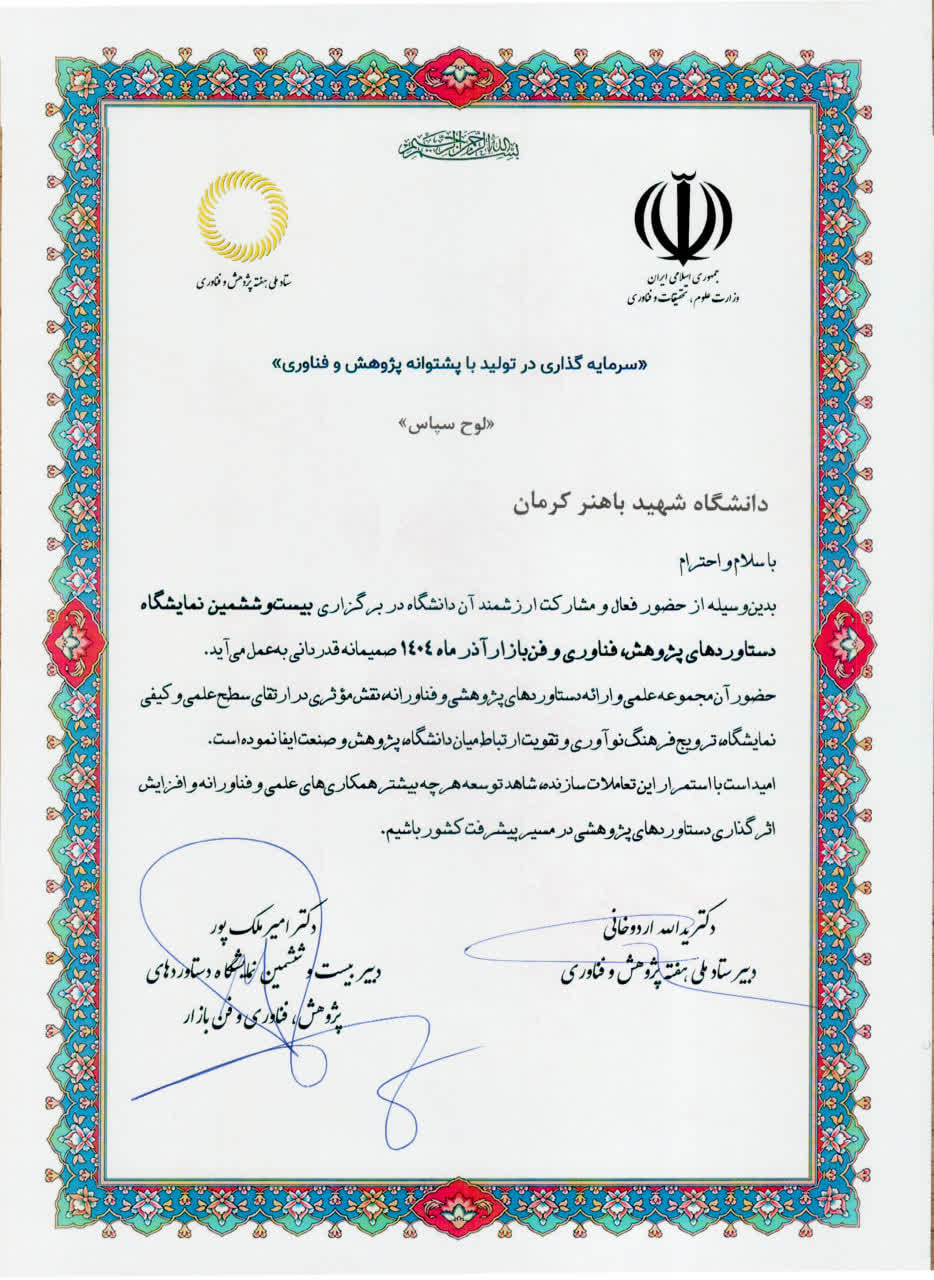 این لوح سپاس با امضای دکتر یدالله اردوخانی، دبیر ستاد ملی هفته پژوهش و فناوری و دکتر امیر ملک‌پور، دبیر بیست و ششمین نمایشگاه دستاوردهای پژوهش، فناوری و فن‌بازار، به دانشگاه شهید باهنر کرمان اهدا شد. در متن تقدیرنامه، حضور مؤثر دانشگاه و ارائه ظرفیت‌ها و توانمندی‌های پژوهشی و فناورانه آن، عاملی مهم در ارتقای سطح علمی و کیفی نمایشگاه، ترویج فرهنگ نوآوری و تقویت پیوند دانشگاه، پژوهش و صنعت عنوان شده است.