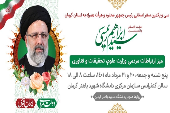 به گزارش روابط عمومی دانشگاه شهید باهنر کرمان، با توجه اینکه سفر رییسجمهور و هیات دولت در روز جمعه ۲۱ مردادماه به کرمان انجام میشود، میز ارتباطات مردمی در روزهای پنج شنبه و جمعه 20 و 21 مرداد ماه 1401 در محل سالن کنفرانس سازمان مرکزی دانشگاه شهید باهنر کرمان در خدمت مراجعان حوزه آموزش عالی است.