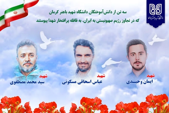 در حملات اخیر رژیم صهیونیستی، سه تن از دانشآموختگان دانشگاه شهید باهنر کرمان، با نثار جان خود، پیام ایستادگی ملت ایران را به جهان مخابره کردند.